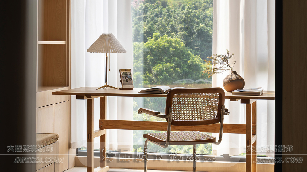 書房與客廳以半墻相隔,通透卻又自成一體,是長輩們最愛的獨立空間,兼具喝茶、書法、臨時臥房等功能,超大的單邊實木畫案可滿足家里長輩書寫大幅字畫的愛好。在豐沛的自然光線下,揮毫潑墨、茶香四溢滿屋,為嫻靜的書房疊加文人氣韻,如同詩人在書房中揮毫潑墨,享受著創(chuàng)作的樂趣。