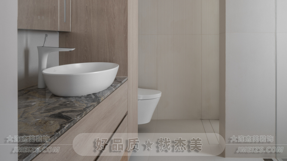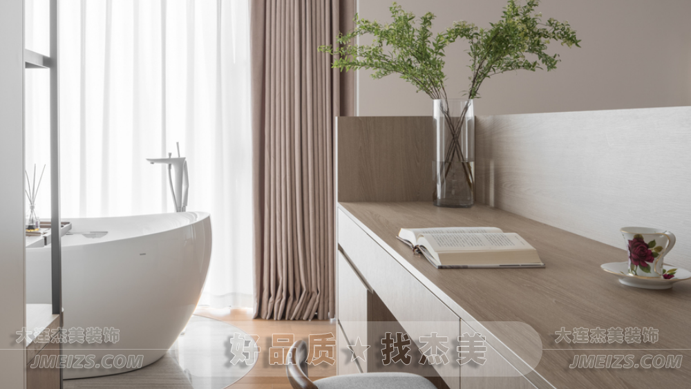 衛生間的設計考慮了實用性與美觀性。床頭靠背后的定制化妝桌為女屋主提供了便利的日常護膚和化妝空間。