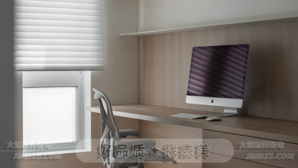 書房的設計旨在為屋主提供一個寧靜的學習和工作環境。書桌的定制與墻同寬,超長的尺寸提供了寬敞的工作空間。