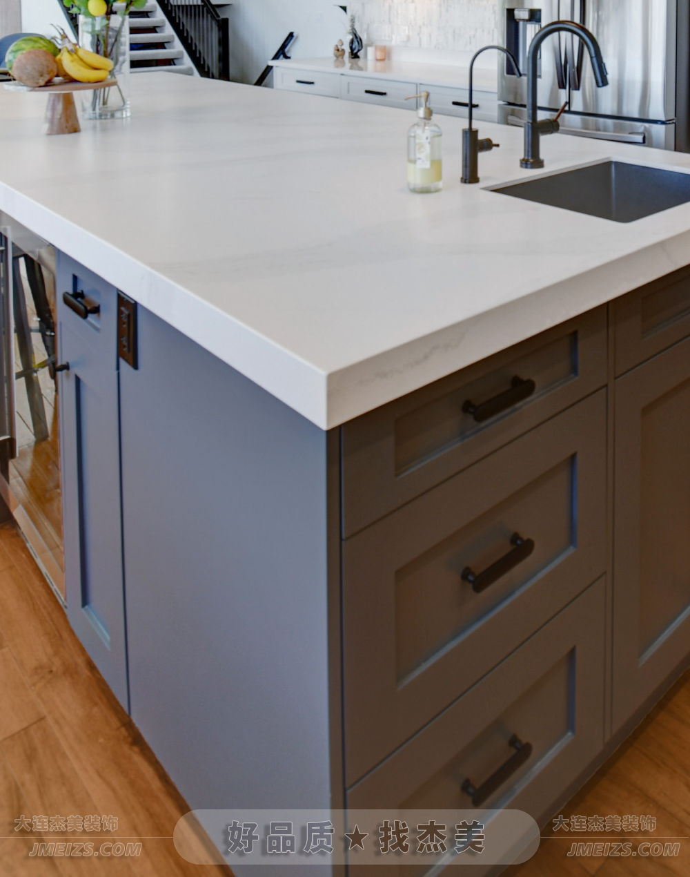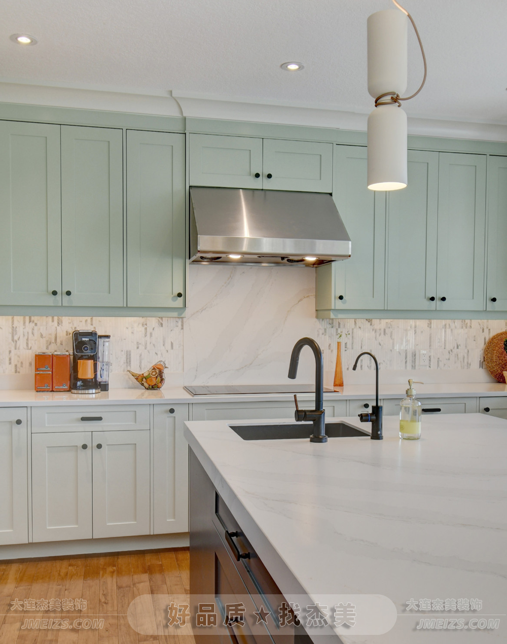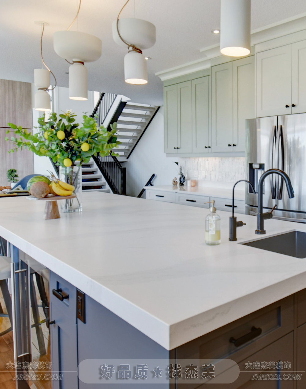 潔白的石英石臺面與不銹鋼烹調(diào)設(shè)備,兼具耐用與科技感。櫥柜式的酒品儲藏柜成為裝飾點睛之筆。