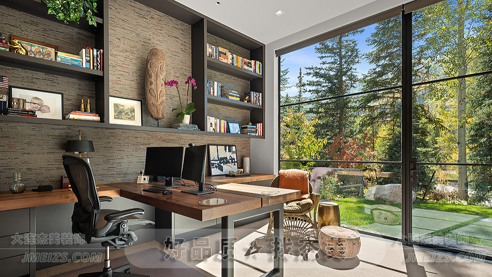 巨大的落地玻璃幕墻是這個書房的靈魂。它將室外的自然風光無縫引入室內,讓人仿佛置身于大自然之中。