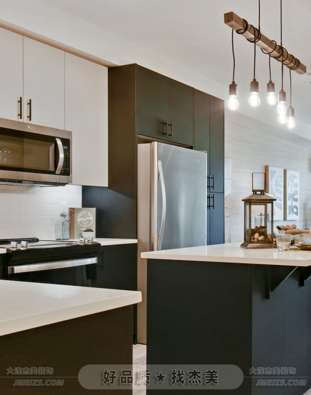 廚房的白色臺面與黑色櫥柜形成了鮮明的對比。