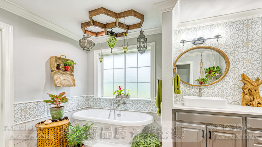 浴室里的自由立式浴缸顯得格外引人注目,它的經典設計和純白色澤讓人聯想到古典歐洲的優雅。四周環繞的植物與天然材質的裝飾品,如同畫布上生動的色彩點綴,為這個空間增添了生機和活力。懸掛的彩色玻璃燈具散發著柔和的光線,映射出浴室的每一個角落,仿佛在敘述著遙遠國度的故事。