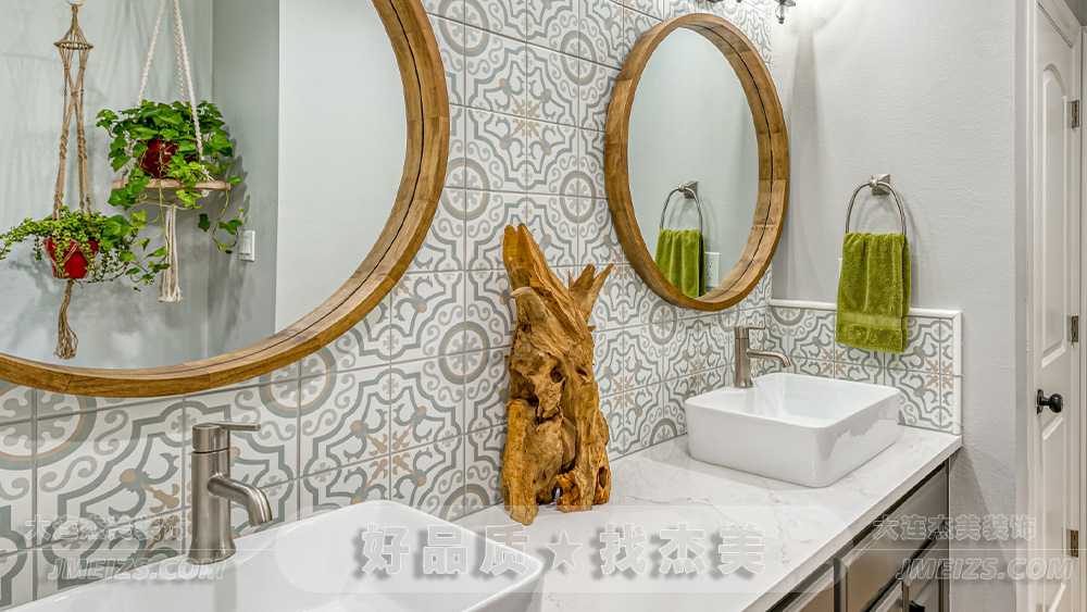 設計師運用了獨特的墻面瓷磚,它們的圖案復古而精致,與現代簡潔的線條和白色的洗手盆形成對比,展示了傳統與現代元素的完美融合。木質的鏡框和天然的裝飾物品,如同大自然的饋贈,增添了一份純粹與自然的美。